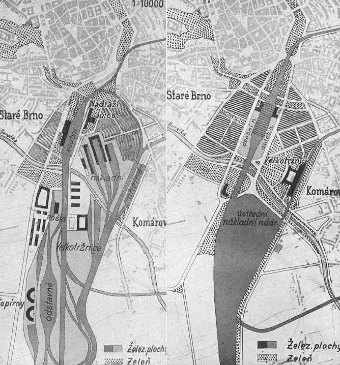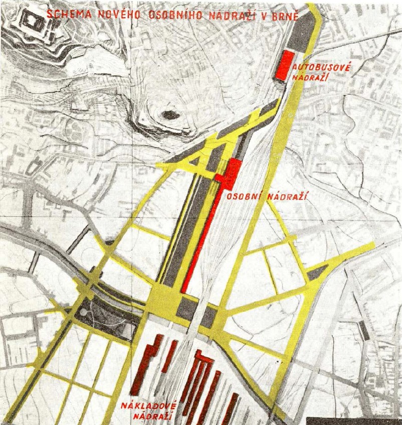 železniční otázky, kterou doporučovala již závěrečná rezoluce poroty soutěže na zastavovací plán města z roku 1928. Ředitelství státních drah rovněž za spolupráce Národního výboru zemského hlavního města Brna na jaře roku 1946 uspořádalo výstavu Brno a železnice, která se věnovala brněnskému železničnímu problému. Nejrozsáhlejší stať do publikace doprovázející výstavu napsal vedoucí městského regulačního oddělení Josef Peňáz, spoluautor nejvýše oceněného návrhu soutěže z roku 1927. V poválečných letech byly také realizovány stavby projekčně připravené či stavebně započaté na konci první republiky či za období republiky druhé, jakými kromě stavby budovy zemského železničního ředitelství (která však byla dokončena až po únorovém puči roku 1948 a předána do užívání Sboru národní bezpečnosti) byla i stavba nové pražské železniční tratě přes Křižanov a její zaústění do Brna přes Maloměřice, maloměřické seřazovací nádraží či železniční stanice v Řečkovicích, Králově Poli a Židenicích.
