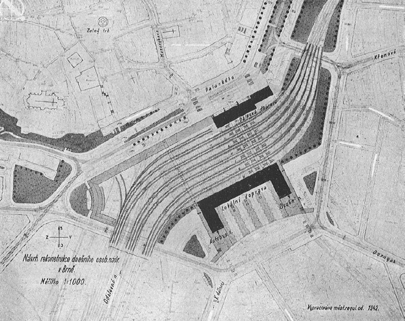 Ve stejném roce – tedy roku 1942 – vypracovalo však nové schéma řešení brněnského železničního problému také Ředitelství státních drah. To umístilo osobní nádraží opět do pruhu mezi ulicí Nové Sady a ulicí Trnitou resp. Opuštěnou, nákladové nádraží jižně od něho směrem ke Komárovu na vnitřní, levý břeh řeky Svratky a odstavné nádraží rozvinulo v pruhu na jih podél Vídeňské ulice až téměř k Ústřednímu hřbitovu. Spletité vedení železničních tratí a kolejišť přitom v jižním sektoru města z podstatné části projekt ponechal.