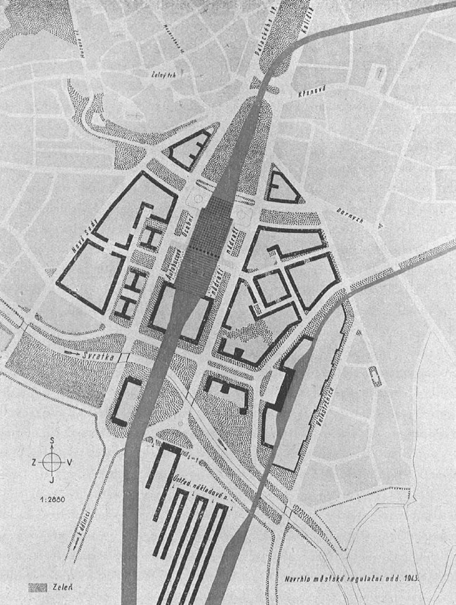 Městské regulační oddělení na tento úřední návrh reagovalo jeho úpravou, obsahující jednak jeho dopravně-železniční zjednodušení, tedy přesun polohy nákladního nádraží na pravý břeh Svratky – dále od centra města – a jednak jeho vevázáním na regulaci přiléhajících částí města. Následujícího roku 1943 potom městské regulační oddělení vypracovalo nový projekt osobního nádraží a regulace města.