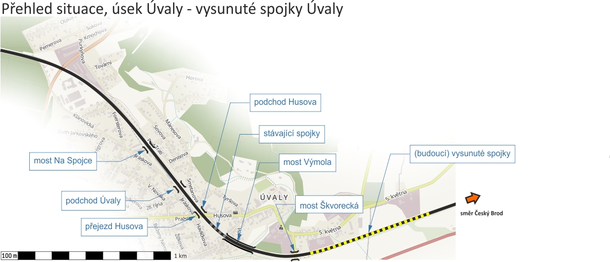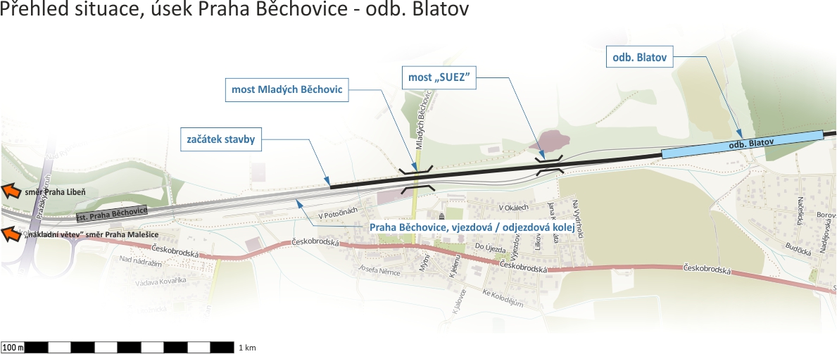 Jen pro pořádek, modernizovaný úsek je součástí dráhy celostátní č. 501 Česká Třebová – Praha Masarykovo nádraží, pro cestující bude spíše známá pod číslem 010/011. Modernizována bude tříkolejná trať v úseku Praha Běchovice (mimo) – Úvaly (včetně a kus za) a dále v odbočce Blatov prvních 396 resp. 301 m kolejí 101 a 102.*