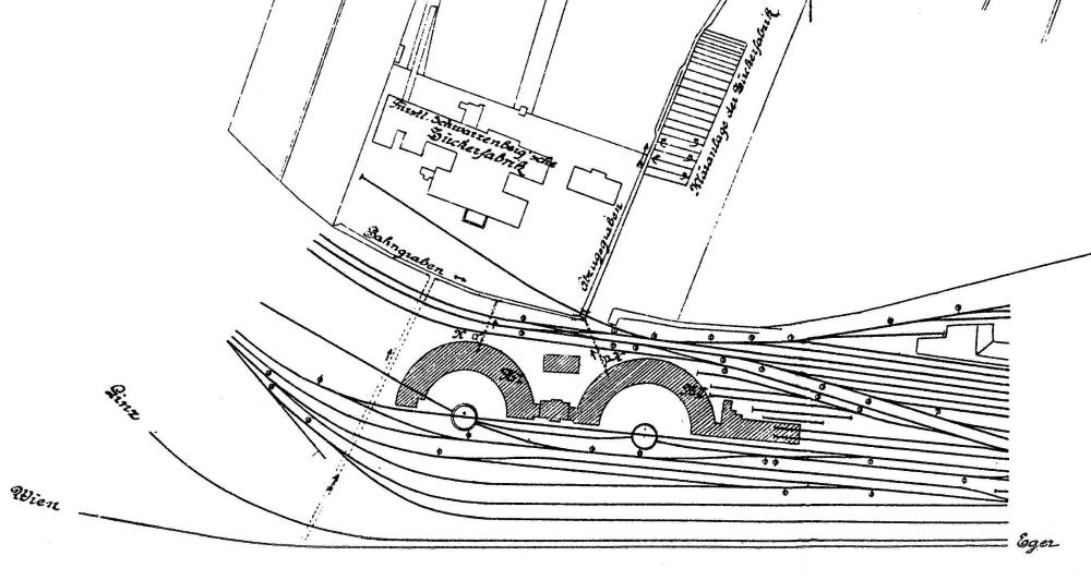 Budějovická výtopna kolem roku 1910. V těsném sousedství výtopny stál Schwarzenberský akciový cukrovar s vlečkou. Před přestavbou uzlu vedla kolej ve směru na Linec a Želnavu za topírnami, které byly vystavěny už v roce 1883 pražskou firmou Friedrich Horschitz, kolej na Vídeň asi 25 metrů před točnami. Kolejiště výtopny bylo přestavbou podstatně rozšířeno a přibyly nové uhelné skládky tzv. figury.