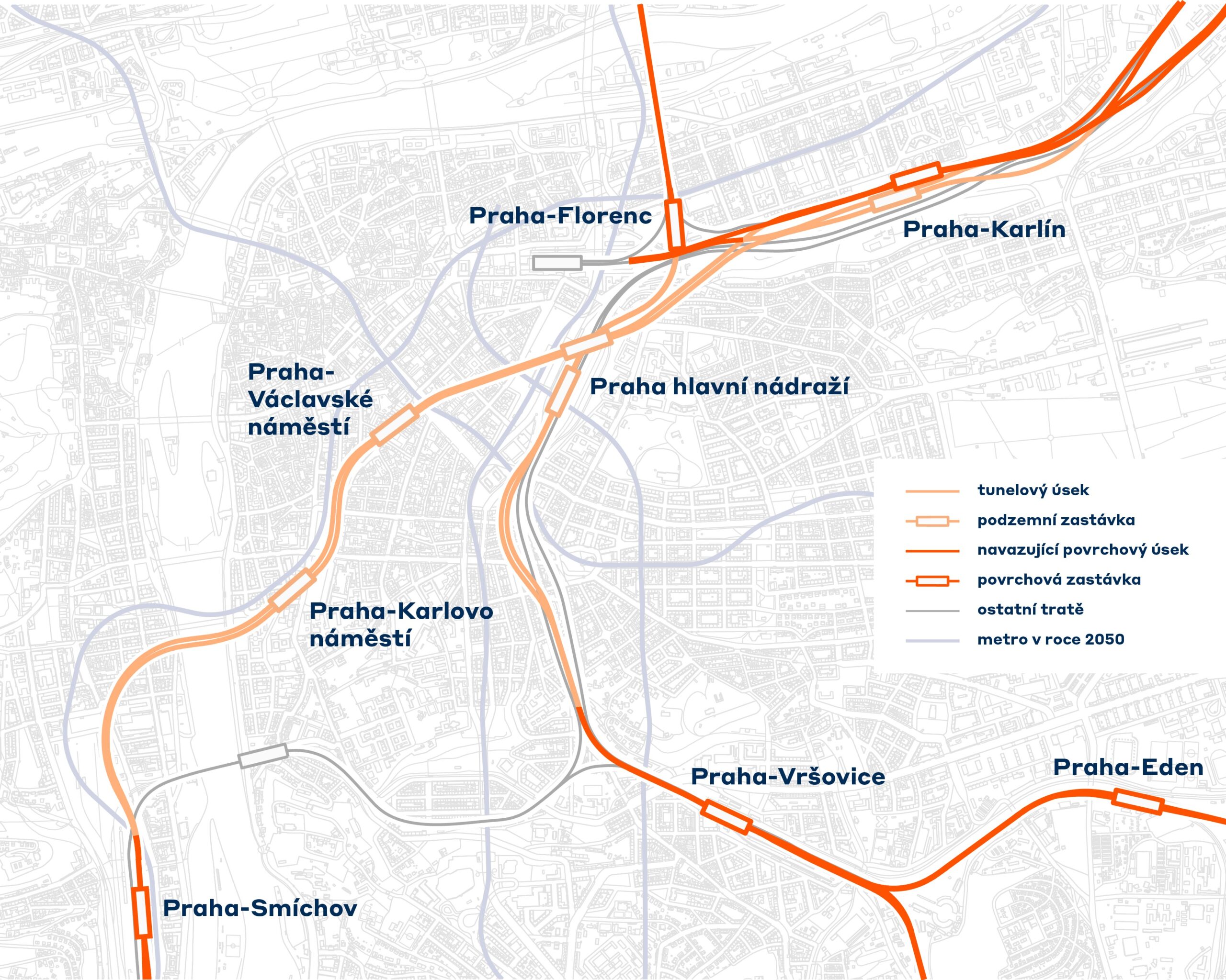 „Centrální komise Ministerstva dopravy vybrala nejvhodnější variantu, v rámci které se v centru Prahy vybudují dvě tunelové trasy v délce 10,6 kilometru a pět nových stanic. Tunely se protnou ve dvou úrovních v centrální stanici pod hlavním nádražím. Jeden povede pod stávajícími podchody na nástupiště, druhý pak bude ještě o úroveň níže. Obě části stanice propojí tunel s eskalátory, vestibuly se budou nacházet na náměstí Winstona Churchilla a v nové odbavovací hale hlavního nádraží,“ říká ministr dopravy Martin Kupka.