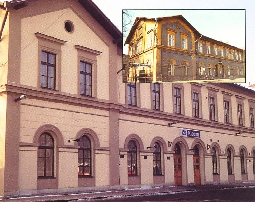 Kladno – výpravní budova před a po rekonstrukci v letech 1994-95 (foto: KK výstavby s.s.r.o.)