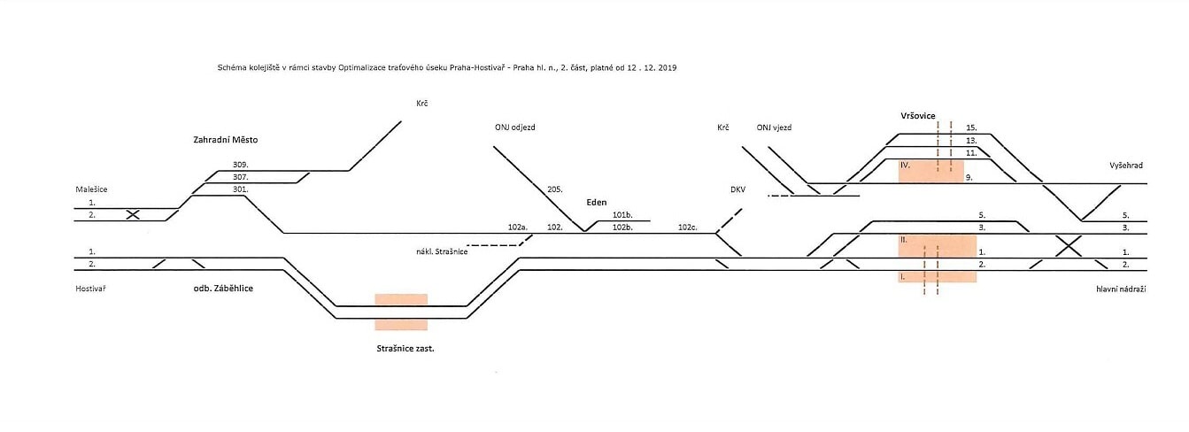 Schéma stavu kolejiště stavby platné od 12.12.2019: