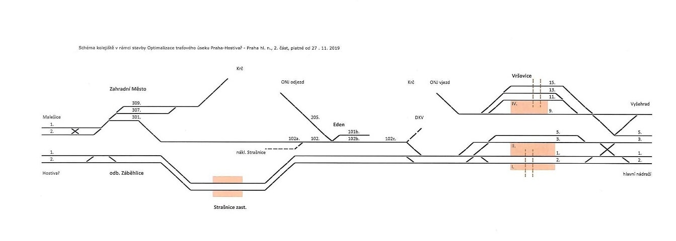 Schéma stavu kolejiště stavby platné od 27.11.2019: