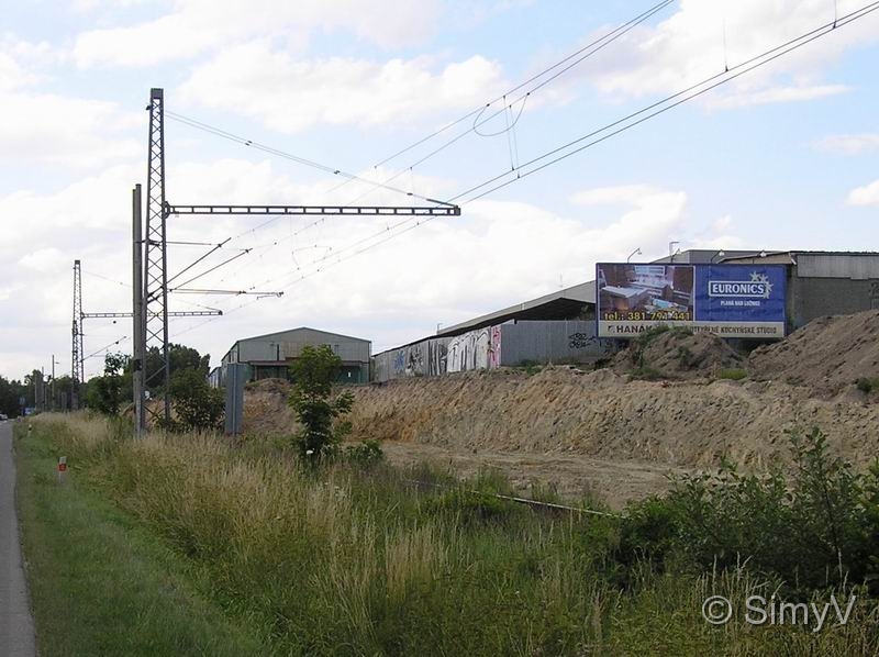 Planá nad Lužnicí - nové sloupy trakčního vedení u hřbitova (v pozadí býv.Pramen)