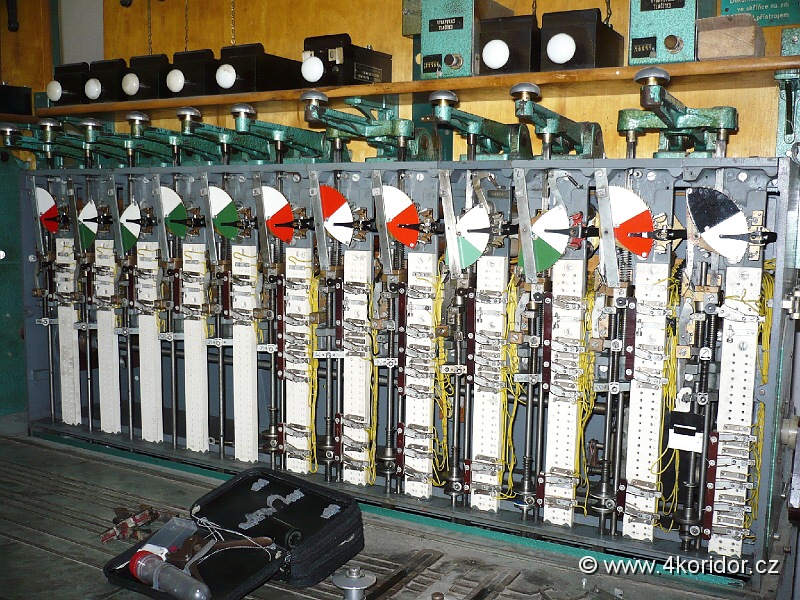 | Pohled do útrob řídícího přístroje - hradlové závěry v pravé části (vlevo směr od/do Bystřice, vpravo od/do Čerčan), v levé části přístroje směr Postupice |