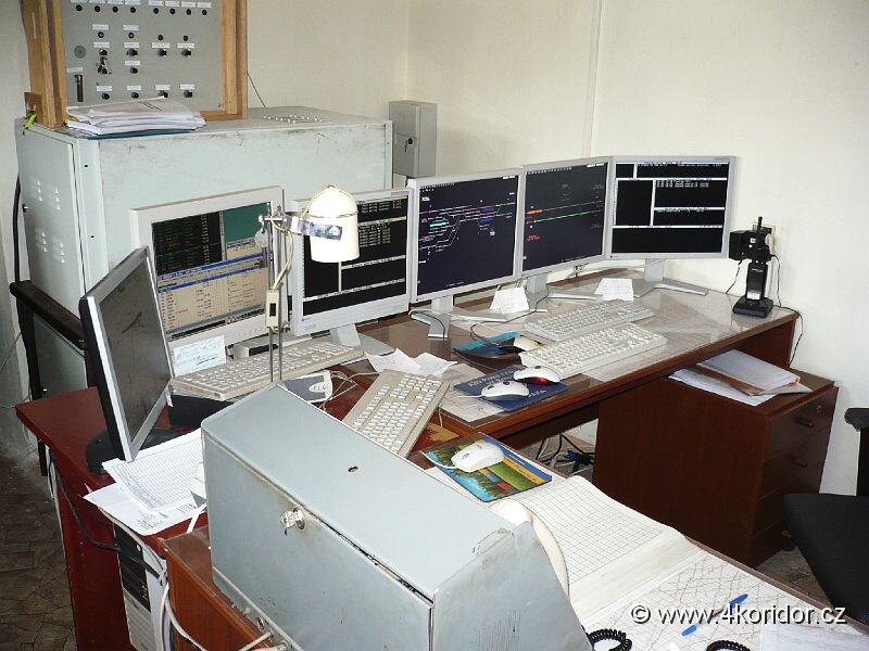 | A toto je pracoviště hlavního výpravčího v provizorní dopravní kanceláři. Tento výpravčí ovládá i Odbočku Bedrč. Vlevo nahoře je deska nouzových obsluh zab.zařízení |
