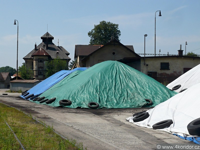Vlevo výpravní budova, uprostřed obytný dům, vpravo skladiště. To blíž k nám je prosím uhlí, které je na kanálech, takže při každém dešti vyplavuje voda přilehlý dvůr obytného domu...