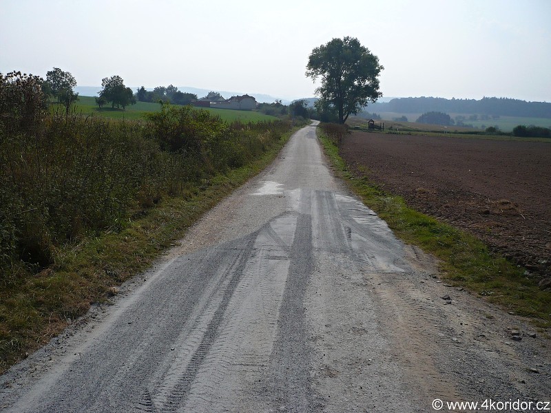 Mokrá Lhota. Stojím na křižovatce cesta od mostu/cesta do Mokré Lhoty/cesta do Černého Lesa a Benešova