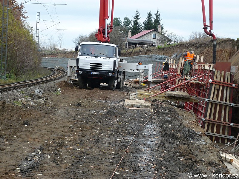 Betonáž opěrné zdi, na ní navazuje téměř dokončená gabionová