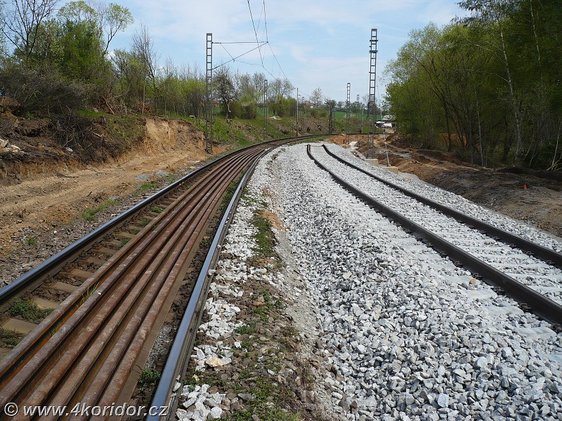 Tady bude přecházet nová, 2.traťová kolej doleva a stane se z ní 1.traťová kolej a naopak