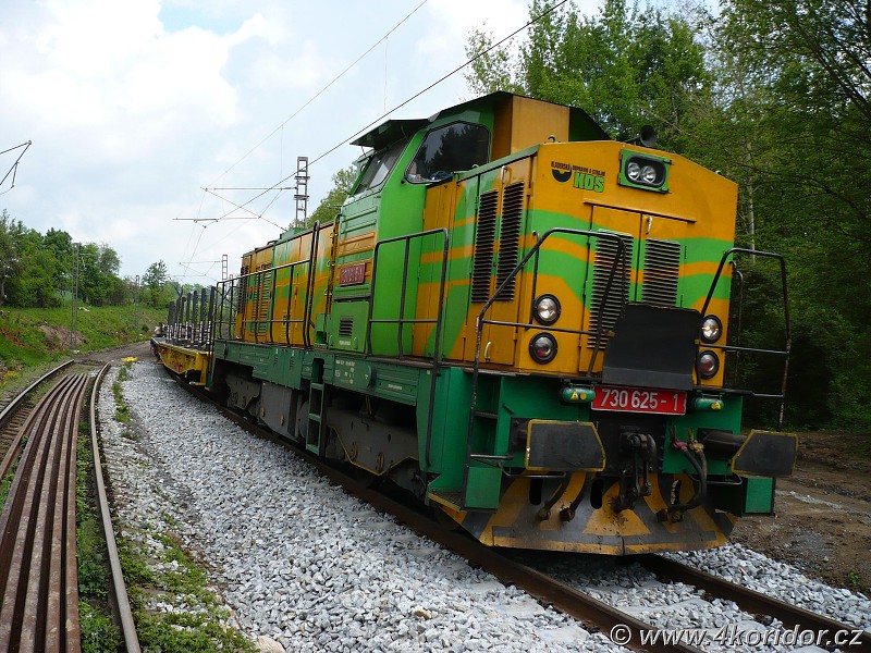 Před hradlem Jírovice je vytrhaná původní traťová kolej a pokladač právě pokládá napojení nové 2.traťové koleje na tu původní. Ta stará odsud pokračuje až k Benešovu jako 2.TK. |