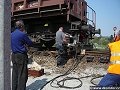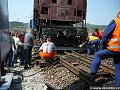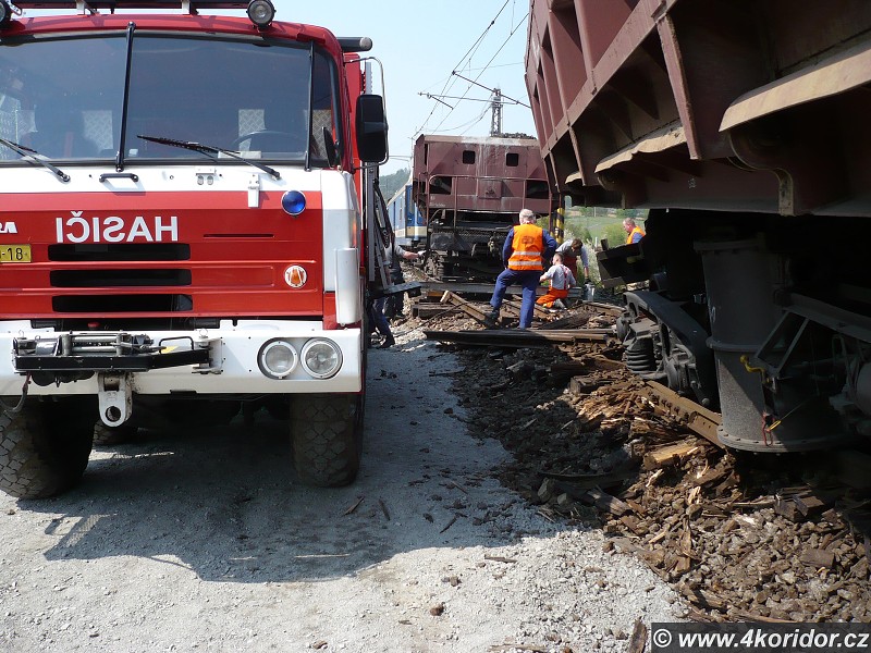 Vykolejení vozů Uas před mostem přes řeku - 13:54 hasiči pomocí hydrauliky nakolejují jeden z vozů
