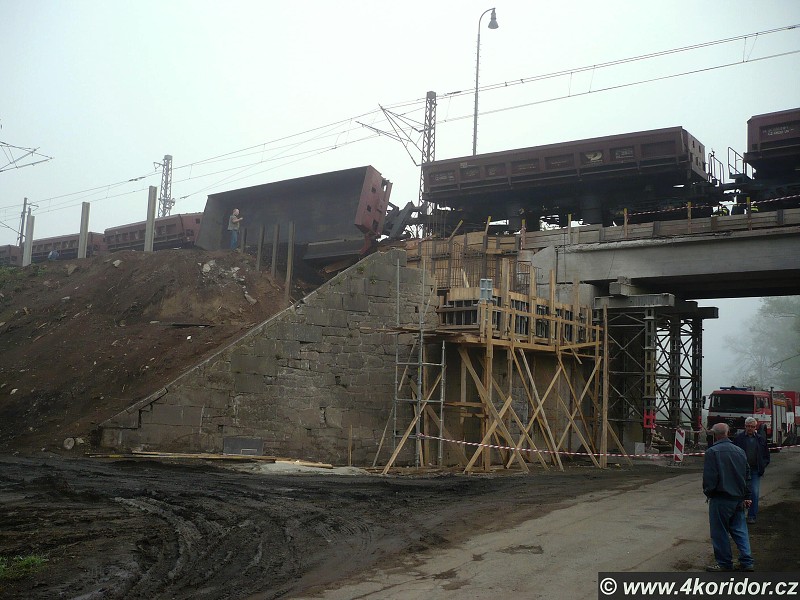 Vykolejení vozů Uas před mostem přes řeku