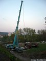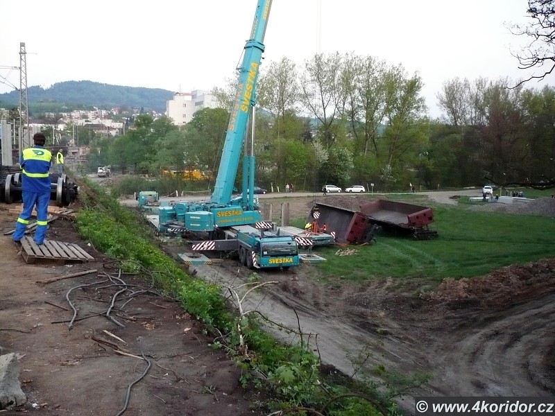 Vykolejení vozů Uas před mostem přes řeku Odklízení trosek pomocí těžké techniky ve večerních hodinách