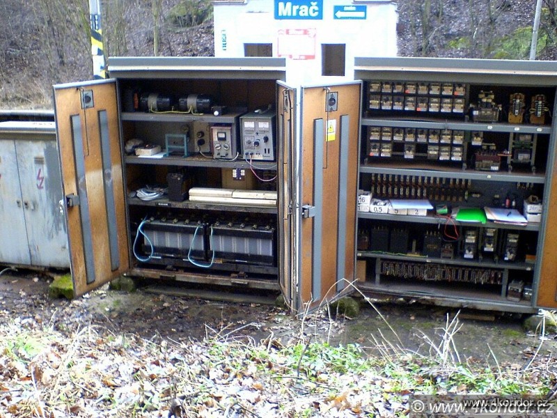 Skříně ŠM - uvnitř je zabezpečovací zařízení, v levých dvou náhradní napájení zařízení Hr.Mrač