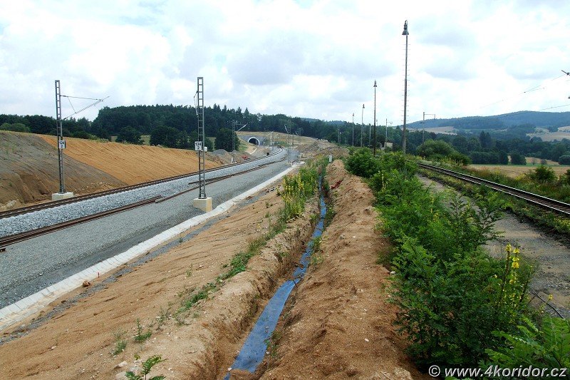 Vlevo nová 1.kolej do tunelu Tomický I, vpravo původní trať a budova St.2
