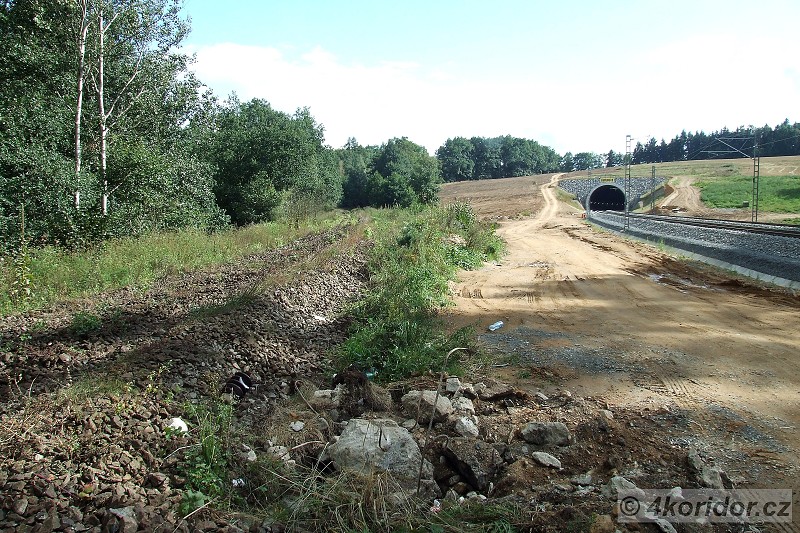 Pohled zpět k výjezdu z tunelu Tomický I., vlevo se krátce přiblíží těleso původní tratě. Sem bude také přivedena přístupová komunikace