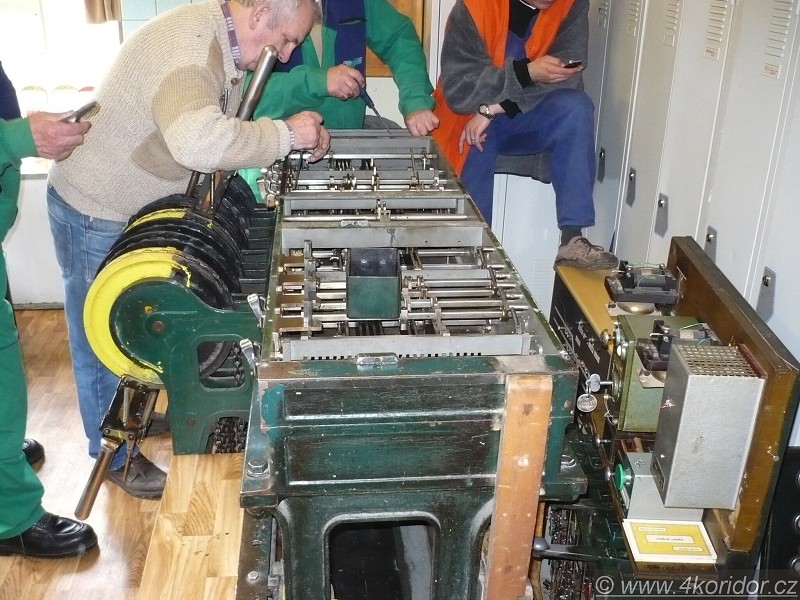 Pohled od dveří, začíná demontáž mechanické části. Nahoře jsou hřebeny, ve kterých se pohybují závislostní pravítka, pod nimi opět hřebeny.