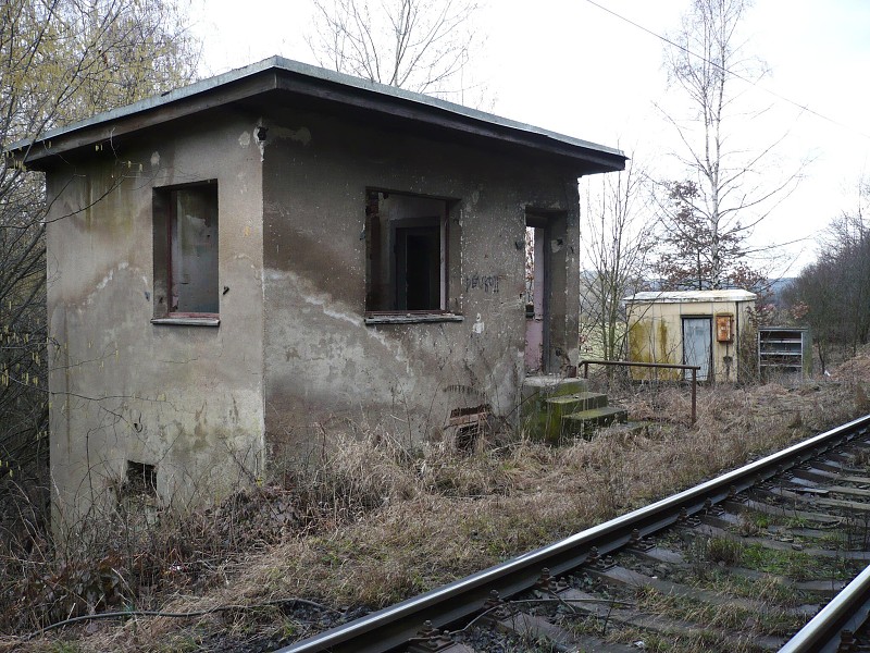 Budova bývalého Hr.Mirošovice, vpravo od ní domk a ŠM skříň zabezpečovacího zařízení hradla