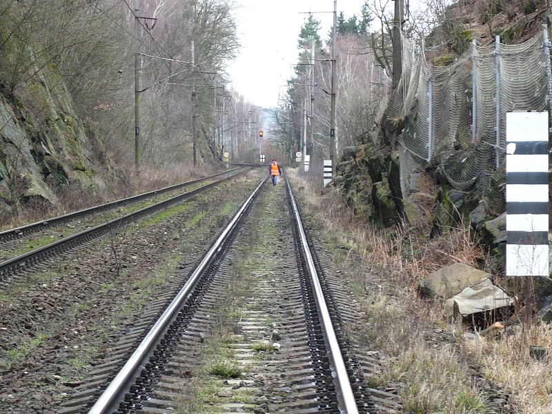 V pozadí předvěst "Př.Lo" Hr.Mnichovice, skály vpravo zajištěné sítí. Potkal jsem pochůzkářku.