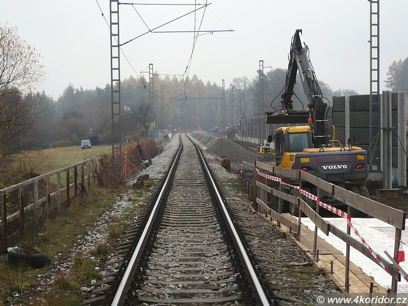 Most přes silnici Mirošovice - Mnichovice, dále je vidět posun koleje