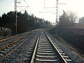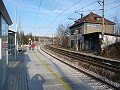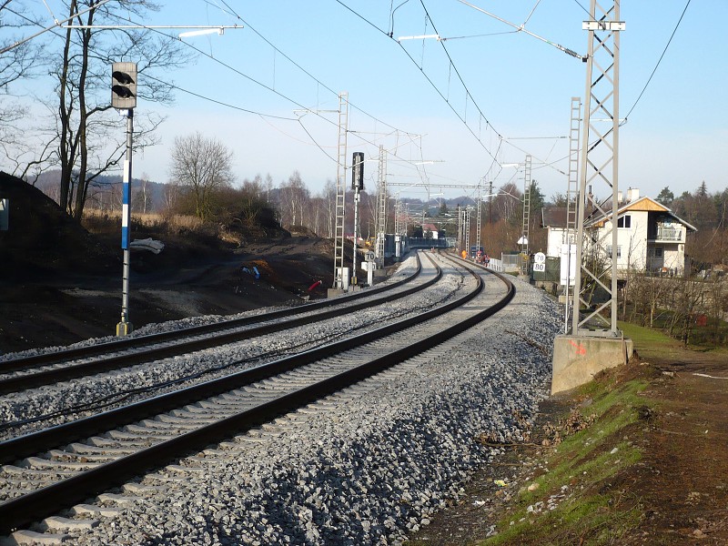 Označník Se7, za ním vjezdové návěstidlo Senohrab "1S", strážní domek a v dáli zastávka Mirošovice
