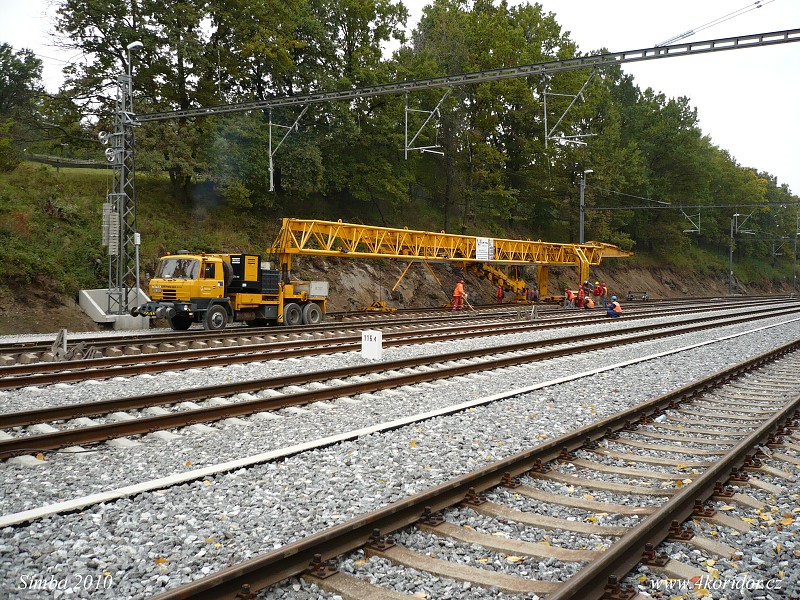 Pokladac kolejovych poli GJW PKP 25/20.1i v plne polni. Na pokladku se pouzila repasovana kolejova pole S49.