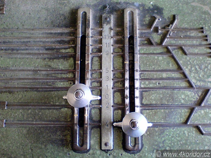 Detail "jezdců" kolejového reliéfu řídícího přístroje