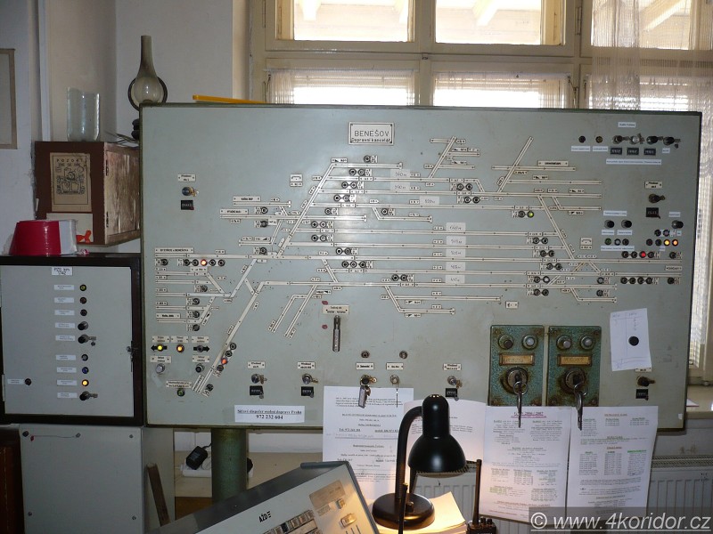 Kolejová deska v dopravní kanceláři, vlevo kontrolní skříňka přejezdu v km 1,742 směr Postupice (Černý les)