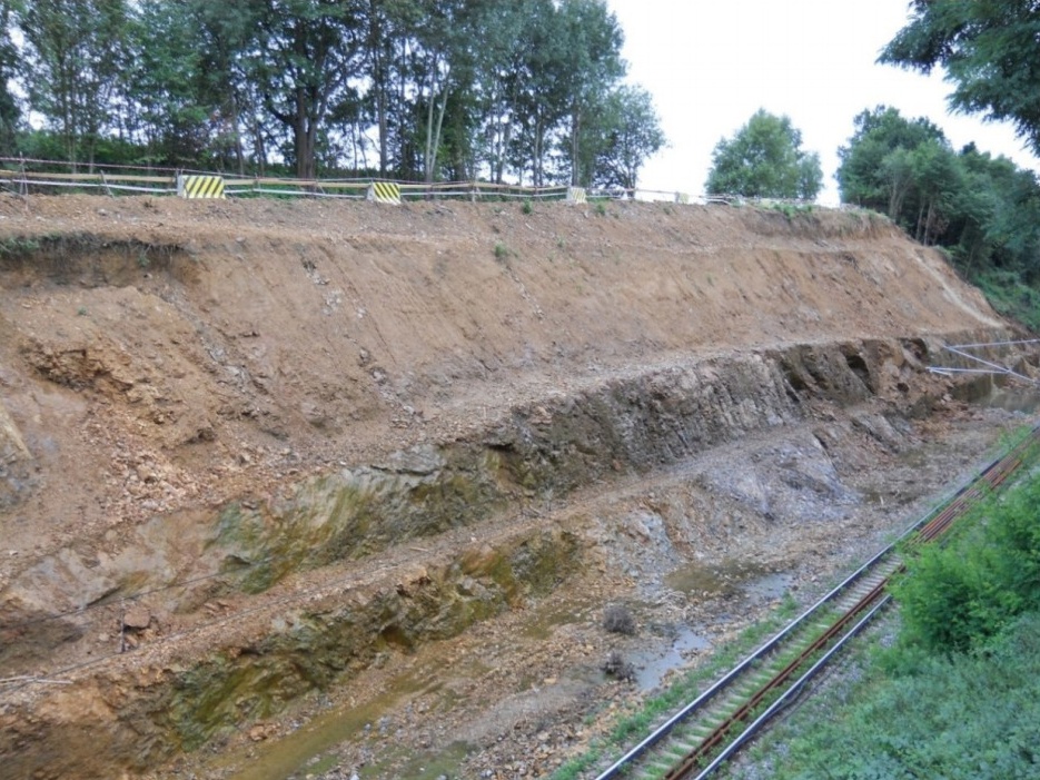 Hloubka zářezu činí až 20 m. Terén nad zářezem se svažuje k trati, hranu zářezu lemuje místní komunikace, po které je třeba předpokládat i těžký provoz zemědělské techniky, do svahu bylo historicky vyústěno odvodnění polí nad tratí (drenáže-kamenná žebra), přítok vody do zářezu byl vzhledem k rozsahu značný, svah narušila i bujná náletová vegetace. Zářez bylo nutno rozšířit pro druhou kolej.