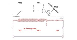 Zde probíhají práce v obvodu budoucí čtyřkolejné výhybny a zastávky Červený Újezd od km 101,721 do km 103,221 v délce 1500 m.