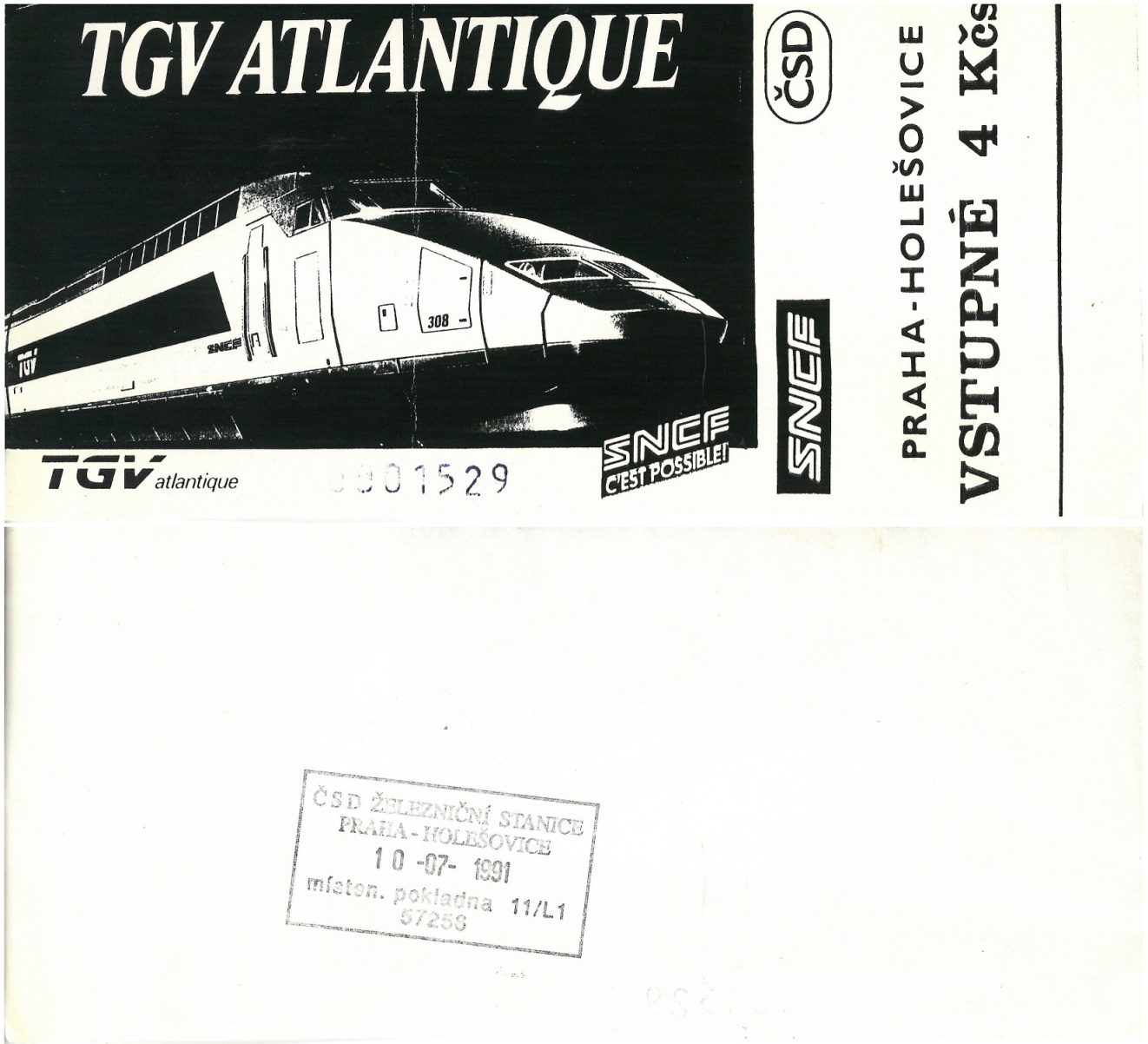 Rekordní souprava SNCF TGV č.325 v Praze-Holešovicích v červenci roku 1991