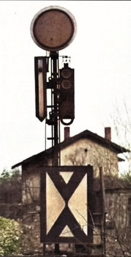 (Obr.: Trojznaková mechanická předvěst žst. Říčany (ve směru od Prahy), ovládaná ze St. 2. Kromě základních návěstí „Výstraha“ a „Volno“ mohla ještě ukazovat návěst „Pomalu“. Při této návěsti svislé přídavné rameno zaujalo šikmou polohu (za tmy bylo doplněno žlutým a zeleným světlem). Vjezdové návěstidlo pak bylo v poloze „Vjezd odbočkou“. V pozadí již zbořený strážní domek č. 123).